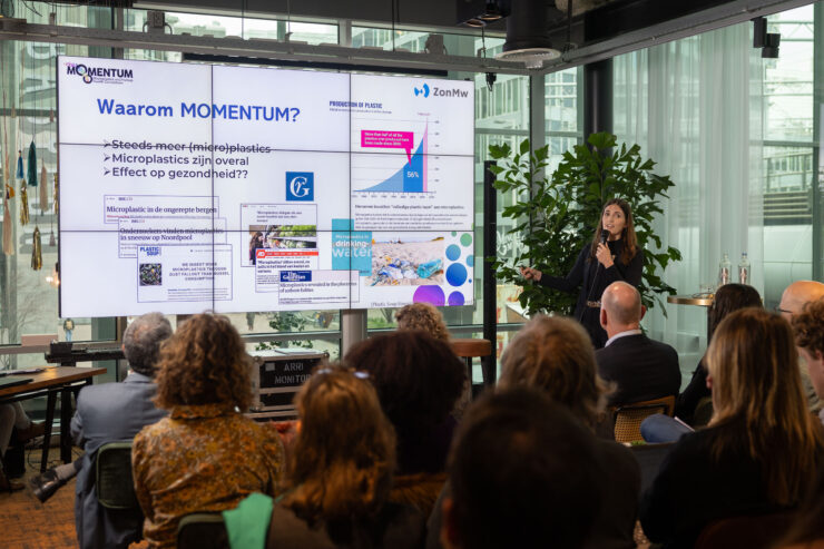 During the event, held at Bar Beton in The Hague, Emma Kasteel presented the main results of the MOMENTUM research. Humans are mainly exposed to microplastics through indoor air, followed by food and drinking water. These tiny particles have been detected throughout the human body. Laboratory studies suggest that they may affect cells, tissues, and organs, for instance by triggering inflammation, disrupting brain function, or interfering with embryonic development. However, as Arfan Ikram emphasized, caution is needed when translating laboratory findings to humans.